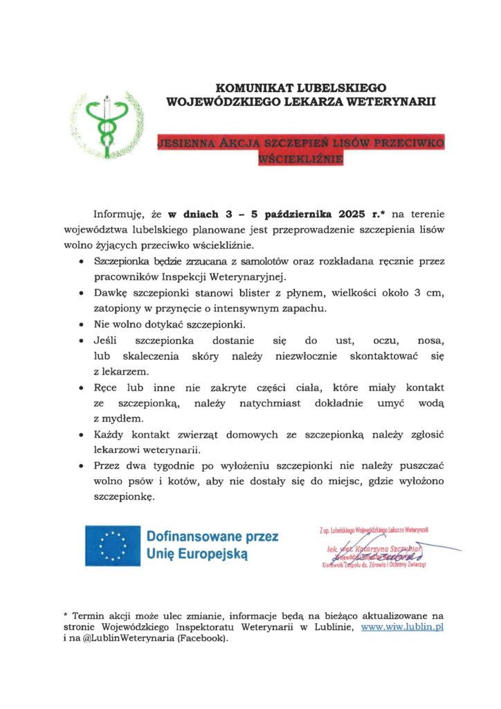 Wojewódzki Lekarz Weterynarii informuje, że w dniach 3-5 października 2025 r. na terenie województwa lubelskiego planowane jest przeprowadzenie szczepienia lisów wolno żyjących przeciwko wściekliźnie.