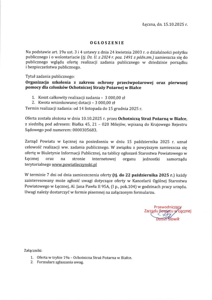 Ogłoszenie o złożeniu oferty w trybie art. 19a ustawy z dnia 24 kwietnia 2003 r. o działalności pożytku publicznego i o wolontariacie – Ochotnicza Straż Pożarna w Białce 15 października, 2025 FORMULARZ ZGŁASZANIA UWAGPobierz OfertaPobierz