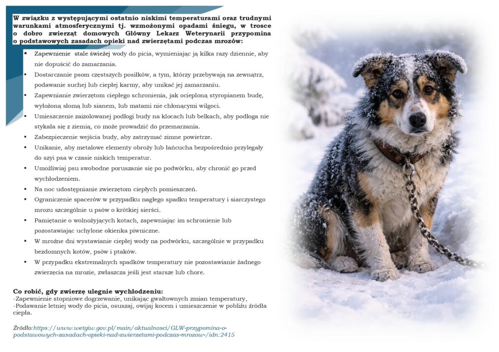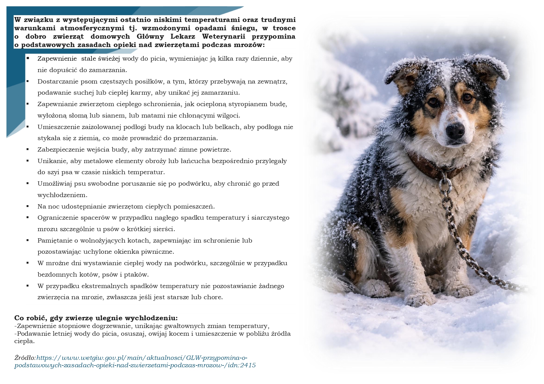 W związku z występującymi ostatnio niskimi temperaturami oraz trudnymi warunkami atmosferycznymi tj. wzmożonymi opadami śniegu, w trosce o dobro zwierząt domowych Główny Lekarz Weterynarii przypomina o podstawowych zasadach opieki nad zwierzętami podczas mrozów.