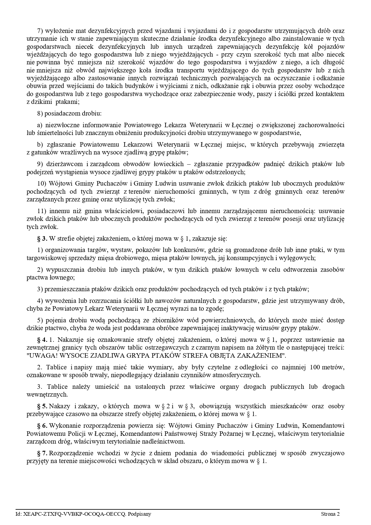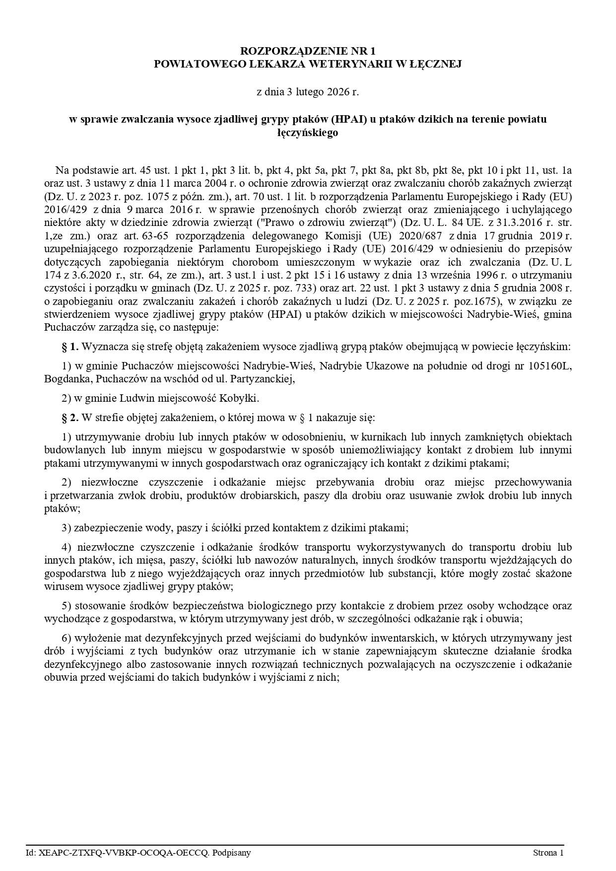 ROZPORZĄDZENIE NR 1 POWIATOWEGO LEKARZA WETERYNARII W ŁĘCZNEJ W SPRAWIE ZWALCZANIA WYSOSCE ZJADLIWEJ GRYPY PTAKÓW (HPAI) U PTAKÓW DZIKICH NA TERENIE POWIATU ŁĘCZYŃSKIEGO