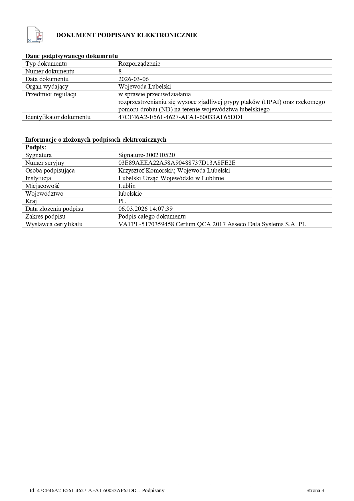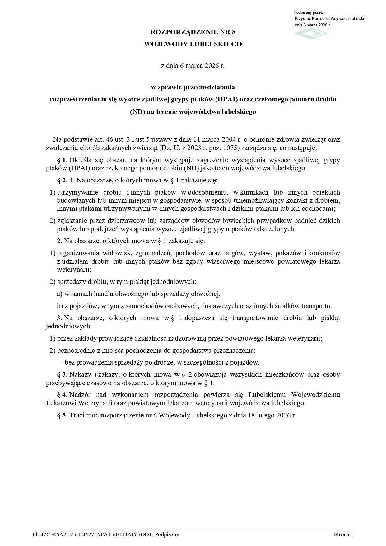 ROZPORZĄDZENIE NR 8 WOJEWODY LUBELSKIEGO z dnia 6 marca 2026 r. w sprawie przeciwdziałania rozprzestrzenianiu się wysoce zjadliwej grypy ptaków (HPAI) oraz rzekomego pomoru drobiu (ND) na terenie województwa lubelskiego