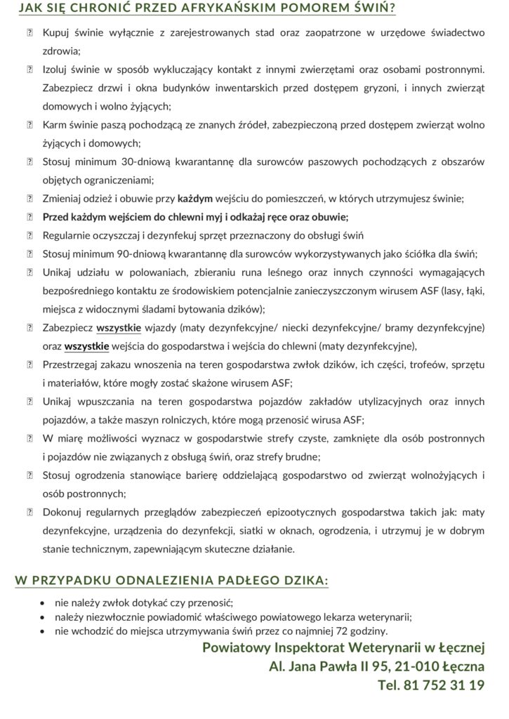 dzikiego ptactwa Powiatowy Lekarz Weterynarii w Łęcznej informuje o konieczności